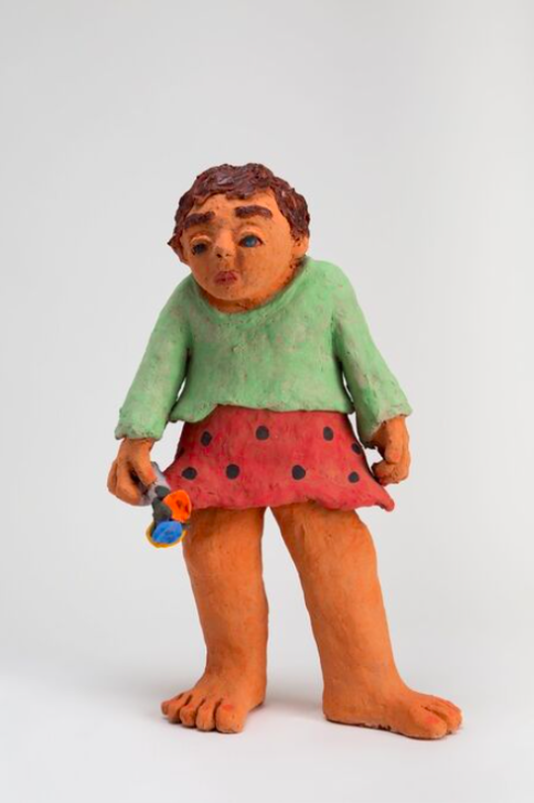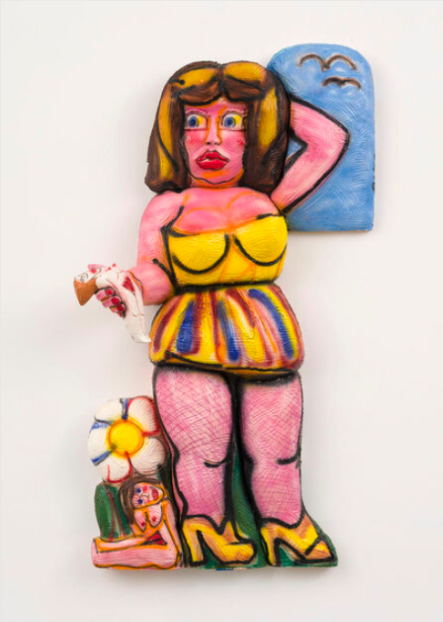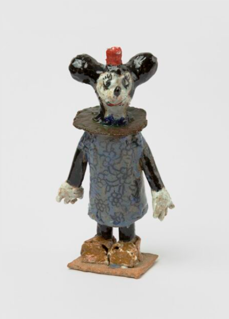 Frimkess’s skill is her ability to conjoin modern folklore in wry, politically conscious picaresque narratives, as in Cup in Spanish (2010). Distorted figurines of Mickey and Minnie Mouse, depicted as wary and a little bewildered, are Frimkess’s most famed works. In 2024, the artist’s work will be the subject of a major retrospective at LACMA.