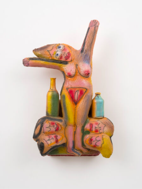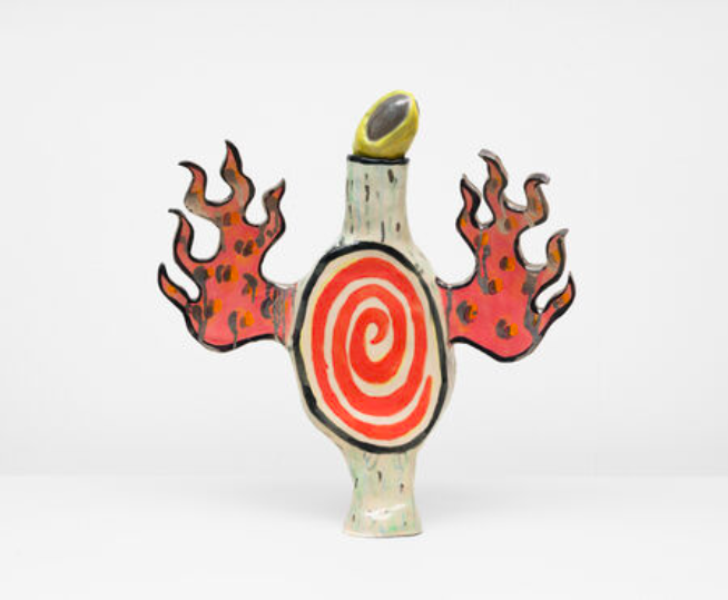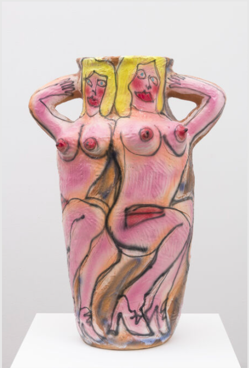 Untitled (2018), for example, speaks to the artist’s nontraditional technique. A misshaped ceramic vase is anthropomorphised into the naked figures of two women, their lips and nipples rouged, akin to a Schiele nude. By applying spray-based glazes onto her pieces, Neri combines the effervescent effect of watercolor with the solidity of a decorative vessel.