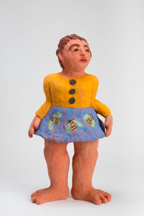 Regarding the pieces featured in “Knit of Identity,” Saul wrote: “Memory, or an editing of memory, informs several of my pieces…fragments that evoke a time and place, refuge, physicality, and act as a talisman.” In Bewildered and Sultry Day (both 2022), Saul creates Botero-esque silhouettes, employing a faux-naïf figuration to depict the human form. Saul’s most recent ceramic figurines are melancholic, reflective of the environmental destruction described in Rachel Carson’s Silent Spring (1962). Often open-mouthed and animated, the works are active guides through Saul’s constructed world.