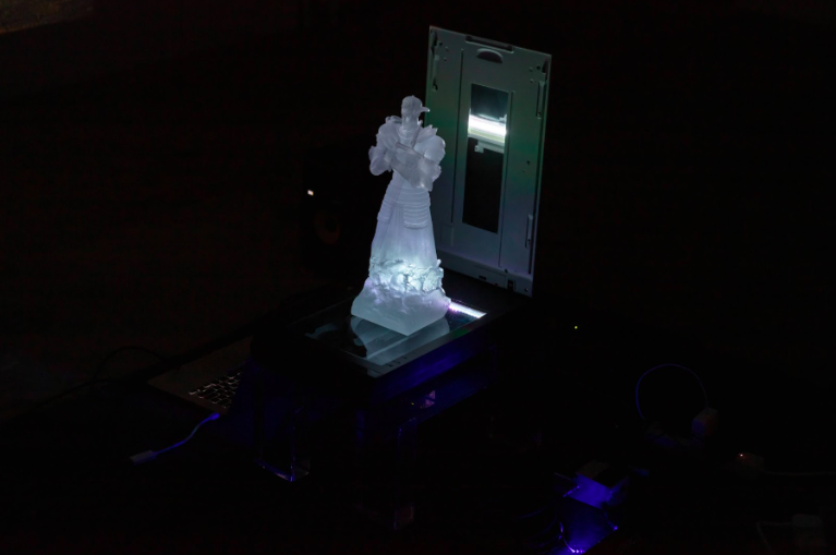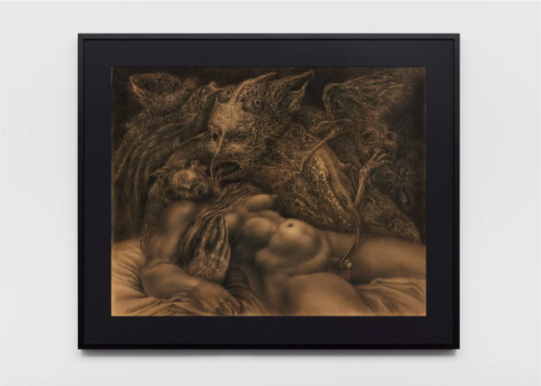 Meanwhile, in I Drink To You Europa (2022), the mythological tale of rape is subverted. Presented as a camp, ceramic candelabra flickering in the darkened gallery, the sculpture is both functional and nonfunctional. Mendick depicts Europa in a moment of rapture, receiving oral sex from Zeus disguised as a bull.